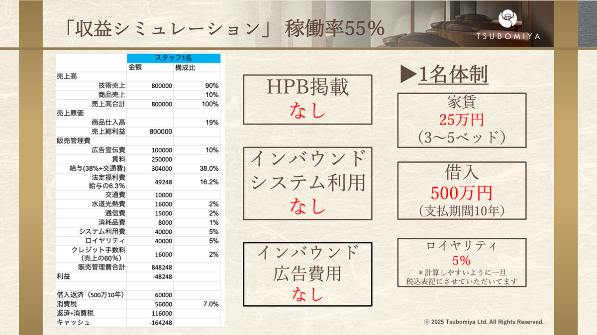 稼働率は55%で税込売上80万円、この稼働率でも結構スタッフさんは疲労します。