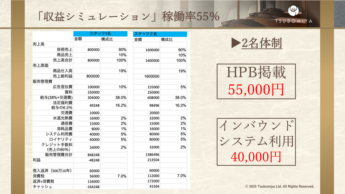 ここも稼働率が40%、スタッフ1名あたりの売上が50万円ぐらいを超えたタイミングで