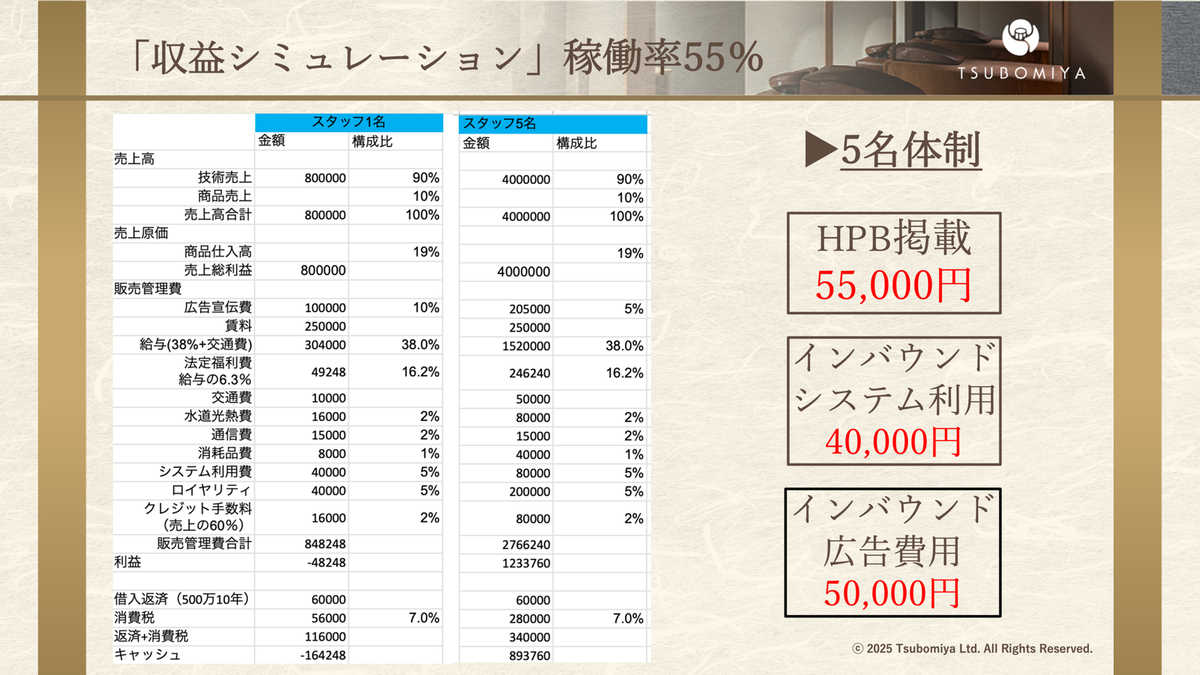 スタッフ数5名▶︎家賃25万円規模のサロンで5ベッド設置できると、かなり強いです。